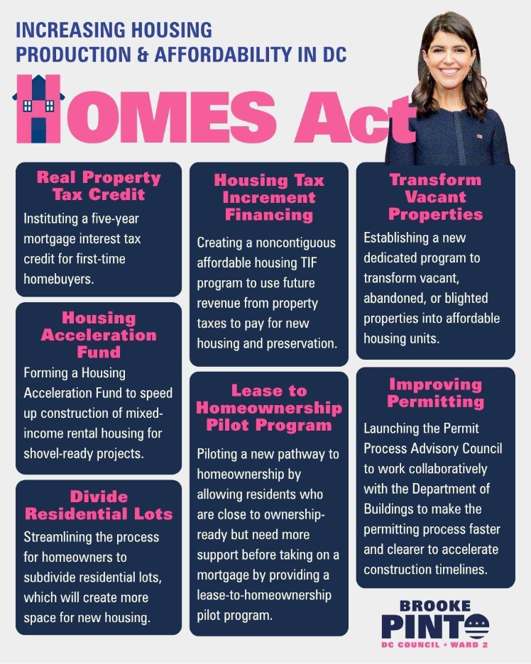“We have an affordable housing crisis in DC, and we have to take bold action to make homeownership accessible for more Washingtonians, stabilize rent, and make it easier to build new types of housing to help bring costs down,” said Councilmember Pinto. “My HOMES Act will help ensure more residents can afford to live and stay in the District — everyone deserves a place to call home."